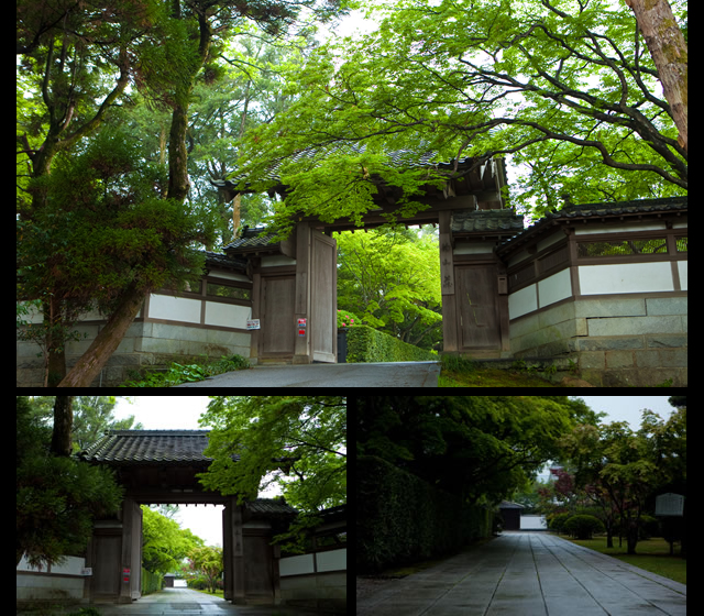 江戸様式の切妻造、桟瓦葺(さんかわらふき)の腕木門(うでぎもん)。 門を入ると玄関前のロータリーまで続く綺麗な石畳の通路。季節ごと変化する木々を楽しめます。